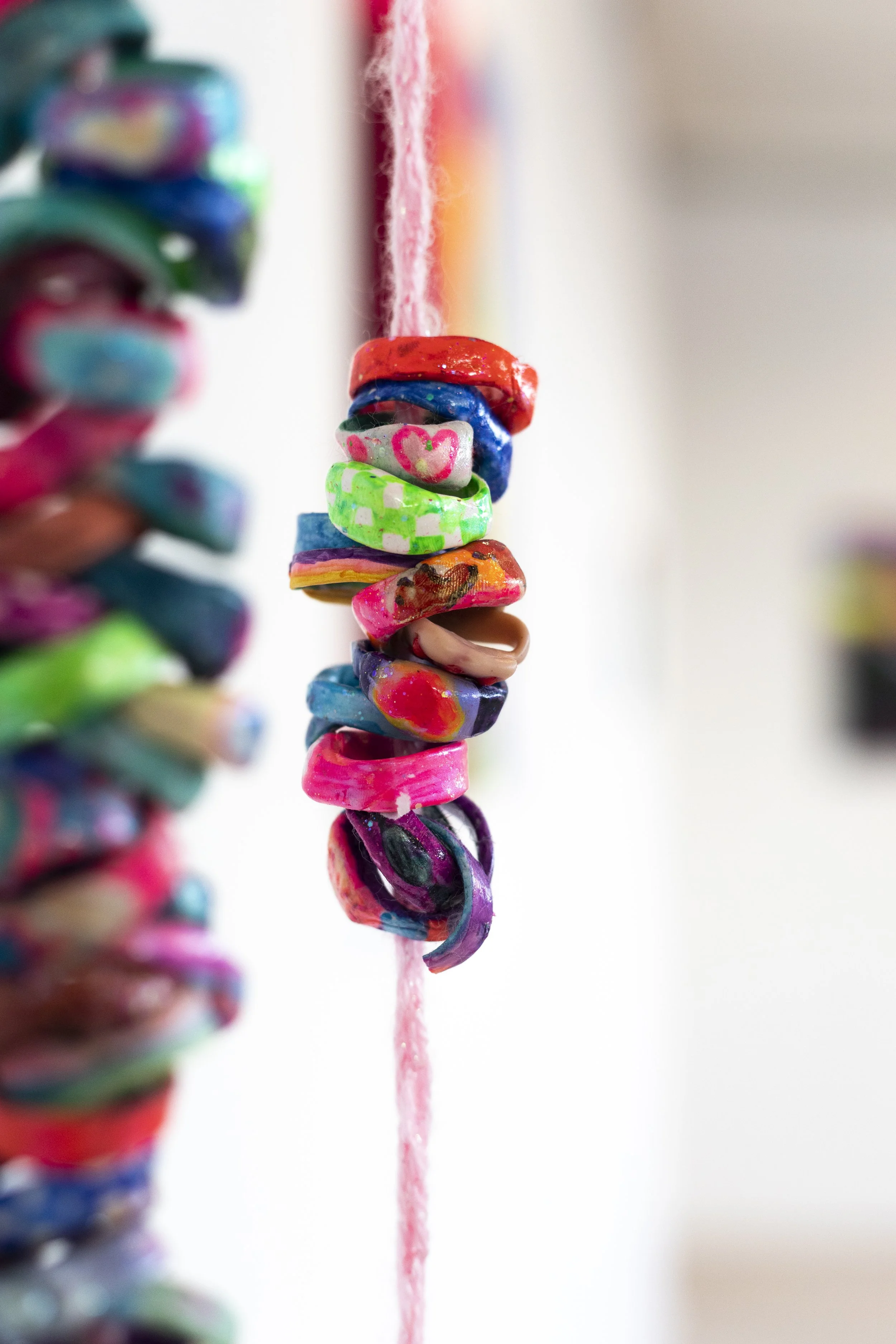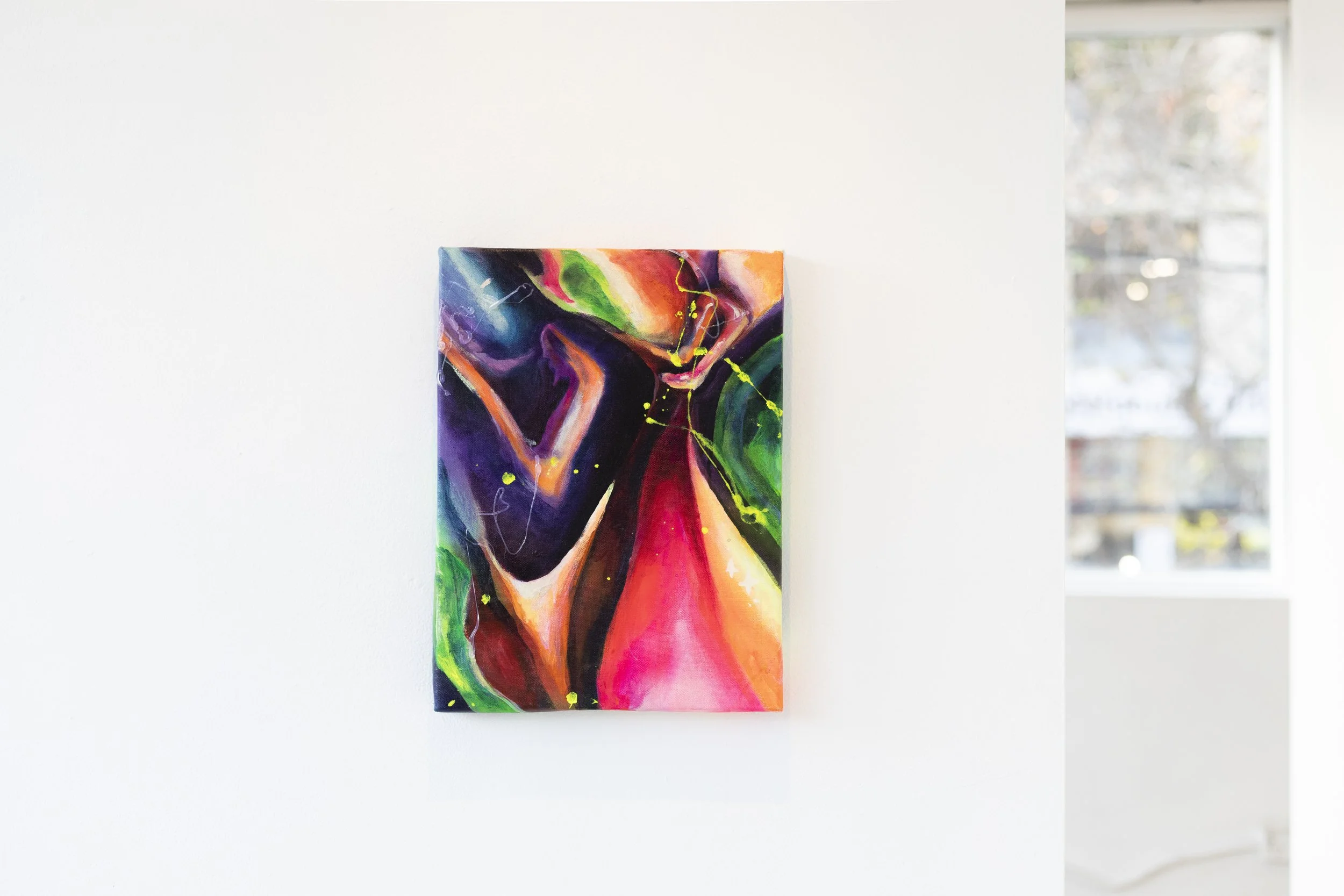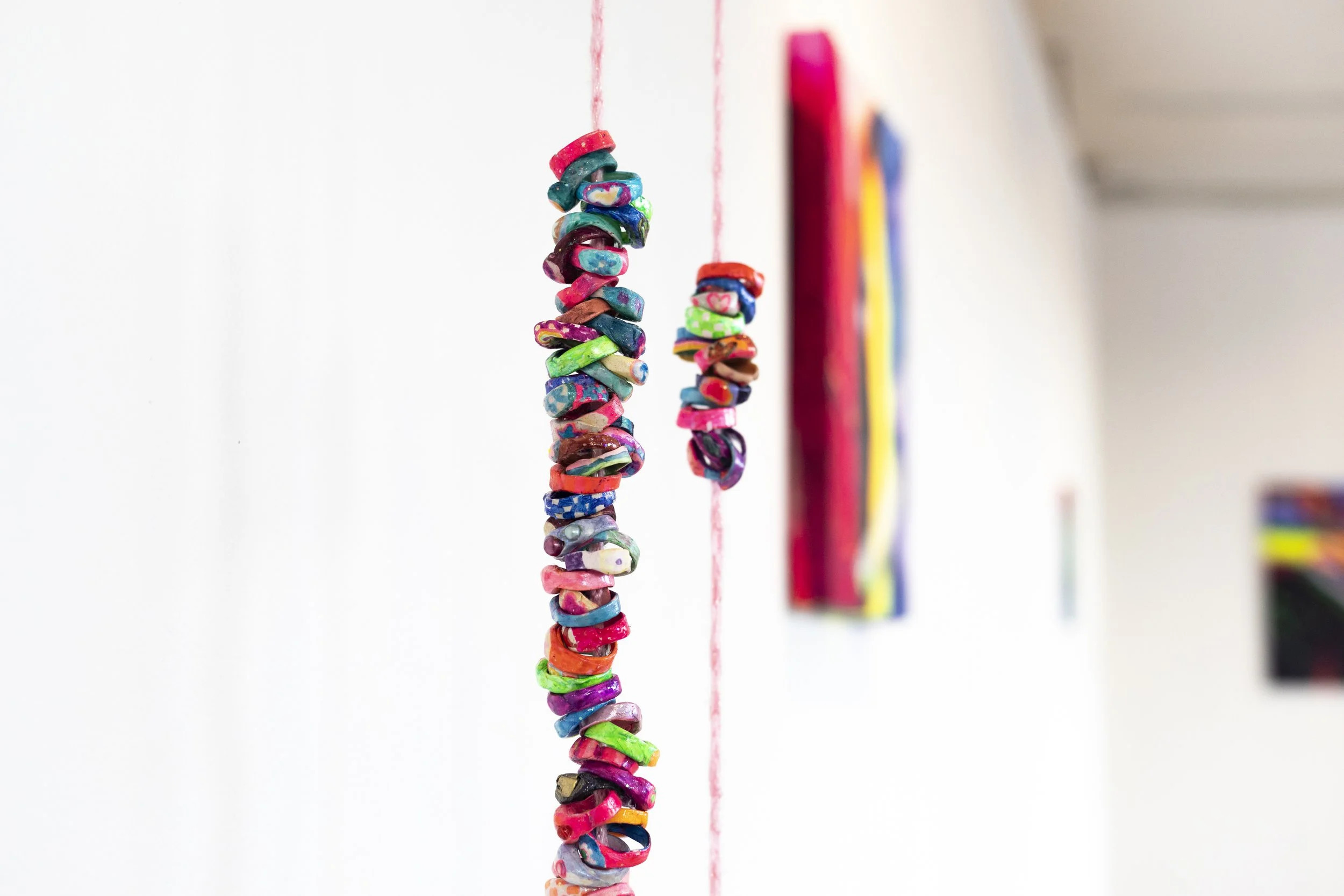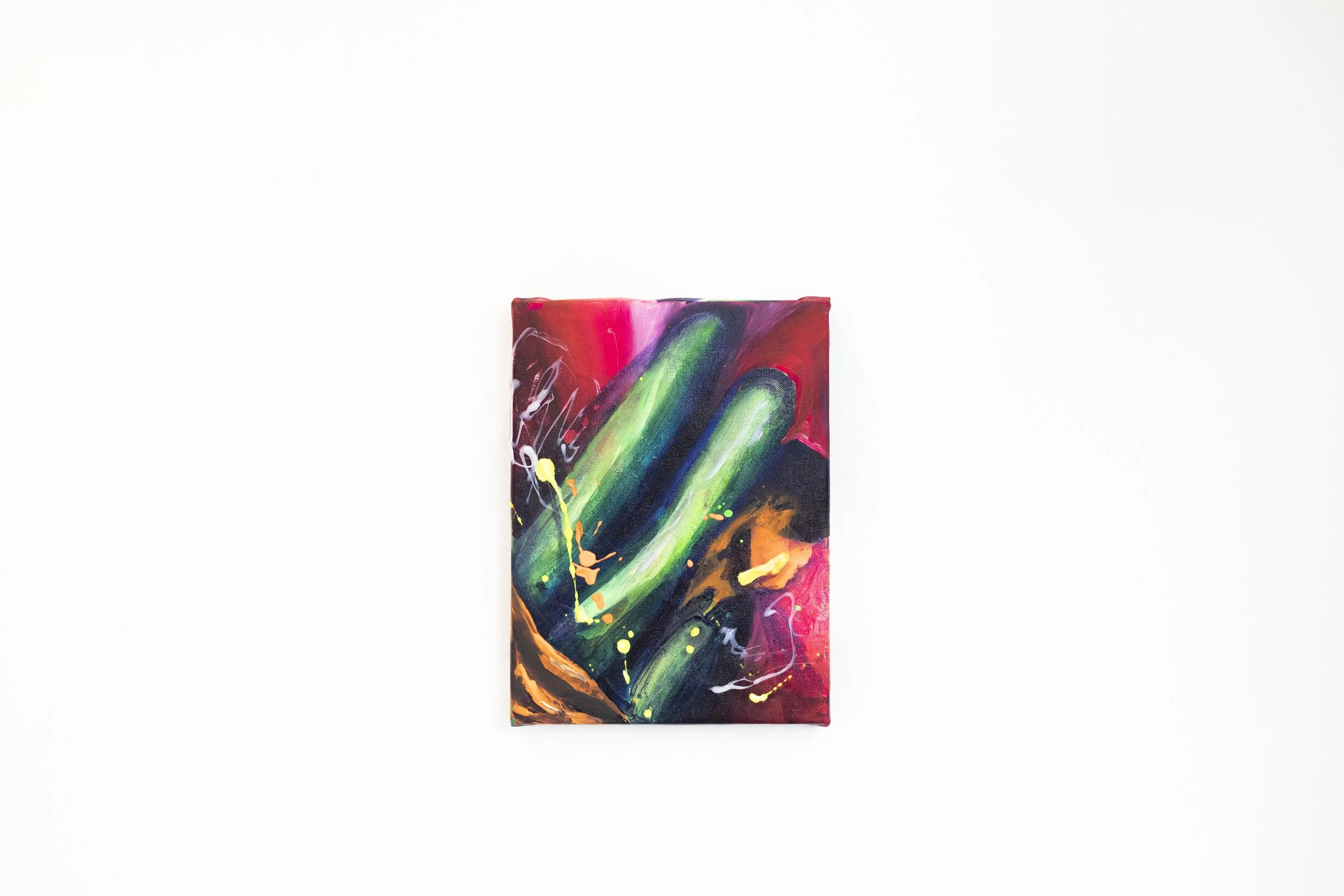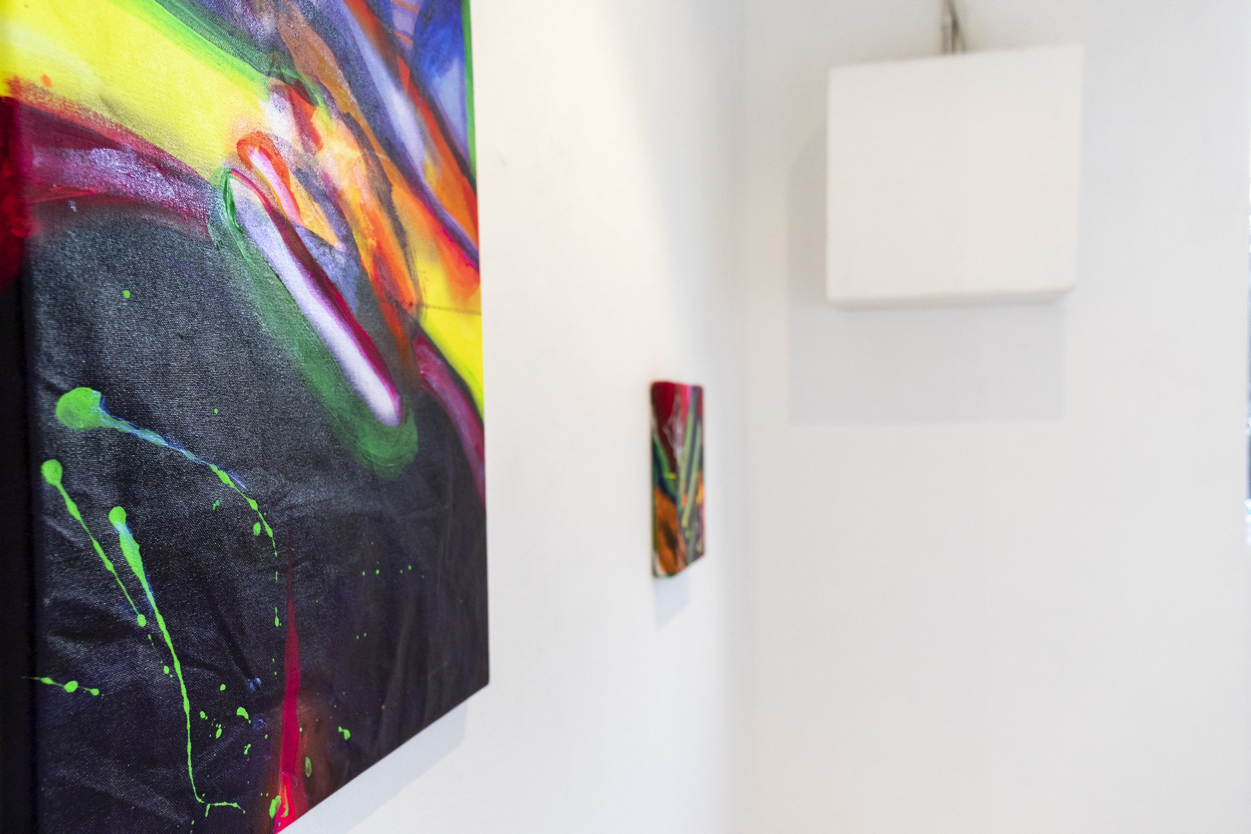 This artwork is a series of works that are a response to her autism diagnosis. Each piece of work is a series of paintings that serve as an act of escapism, diverging from a world that is perplexing, to a new space that is comprehensible to her personal existence. Positioning multiple paintings and ceramic vessels together, as though a ritual, the work functions as a portal, using bold colours to push out from the wall and draw the viewer’s gaze into an unknown.